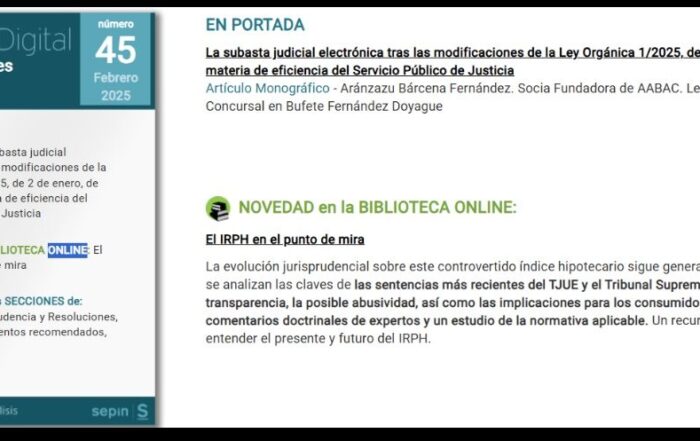 Nuestra compañera Aranzazu Barcena Fernández, En portada en la Revista de Febrero de reclamaciones bancarias en Sepín Editorial Jurídica , analiza la subasta judicial tras la reciente reforma.